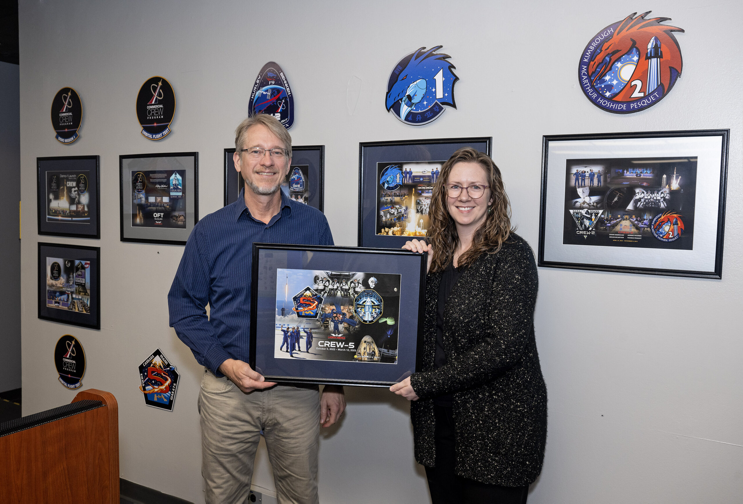 Team members are nominated at Marshall, Johnson Space Center, and Kennedy Space Center – centers that support CCP – to hang the plaque of the mission they supported. David Gwaltney, LVSO (Launch Vehicle Systems Office) technical assistant, was selected to hang the plaque for Crew-5, and Jonathan Carman, deputy SpaceX Falcon 9 lead engineer, was selected to hang the plaque for Crew-6. The Crew-5 mission launched in October of 2022. Crew-6 launched earlier this year in March.