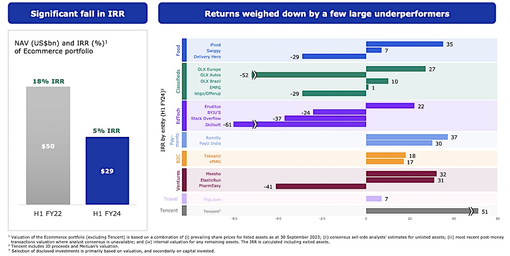The net asset value of Prosus’s holding of its e-commerce portfolio, which features fintech, edtech, food delivery and venture deals, stood at $29 billion at the end of the first half of the financial year 2024, down from $50 billion during the same period two years ago. The IRR fell to 5% in H1 FY24, down from 18% during the same period two years ago, the investment giant said, giving