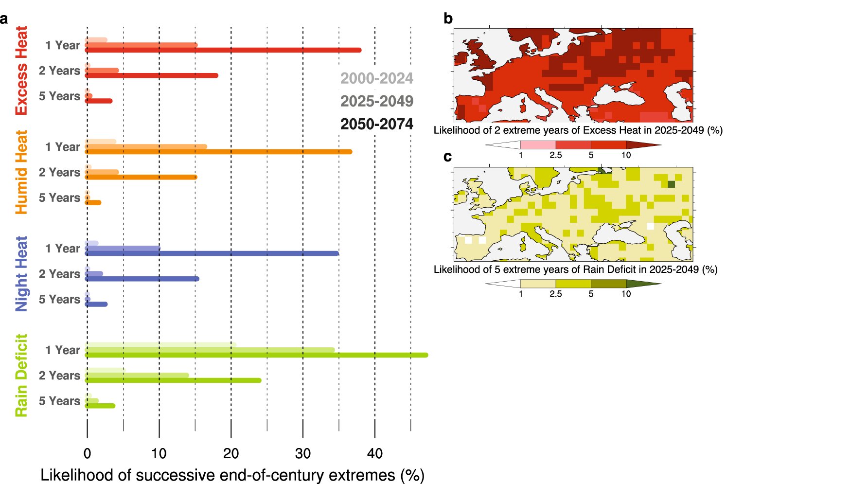 The study suggests that there is a greater than 10% chance of two successive years of end-of-century extreme heat occurring by 2050 to 2075, while 5-year long European megadroughts may also occur.
