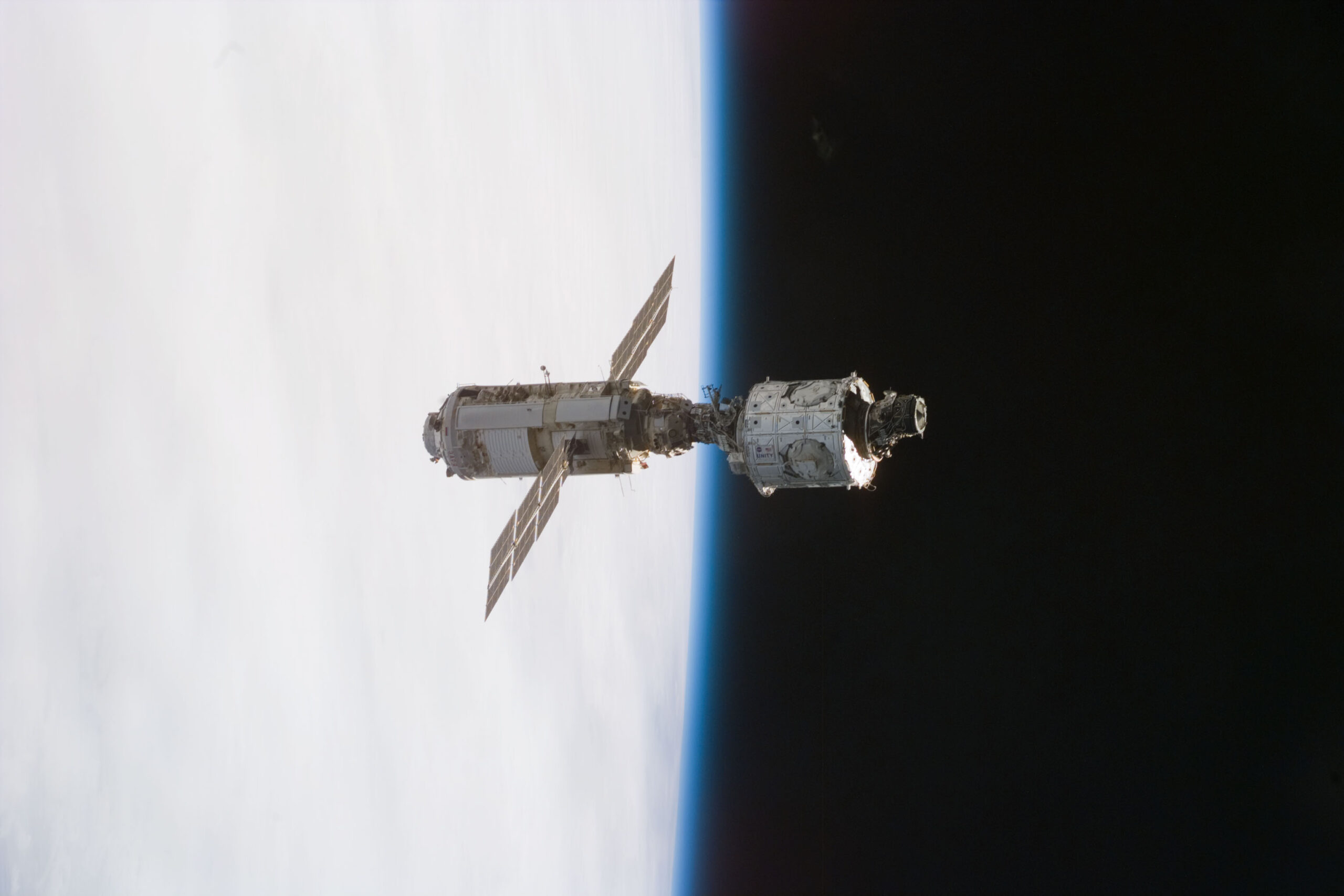 The mated Russian-built Zarya (left) and U.S.-built Unity modules are backdropped against the blackness of space and Earth’s horizon shortly after leaving Endeavour’s cargo bay on Dec. 13, 1998. A few days earlier, on Dec. 6, 1998, the space shuttle Endeavour, mission STS-88, launched from NASA’s Kennedy Space Center in Florida carrying the Unity connecting module and two pressurized mating adapters. The same day, the STS-88 crew captured the Russian Zarya module, launched Nov. 20, and mated it with the Unity node. Unity was the first piece of the International Space Station provided by the United States.