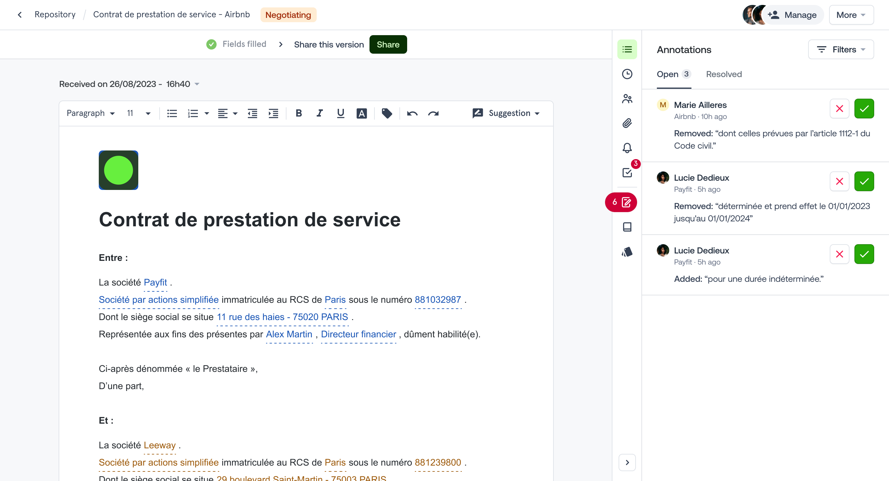 The startup also recently added AI features to reformulate text or change the tone of the contract. In the future, the company plans to add more AI features so that you can “talk with your contract” instead of skimming through 30 pages.