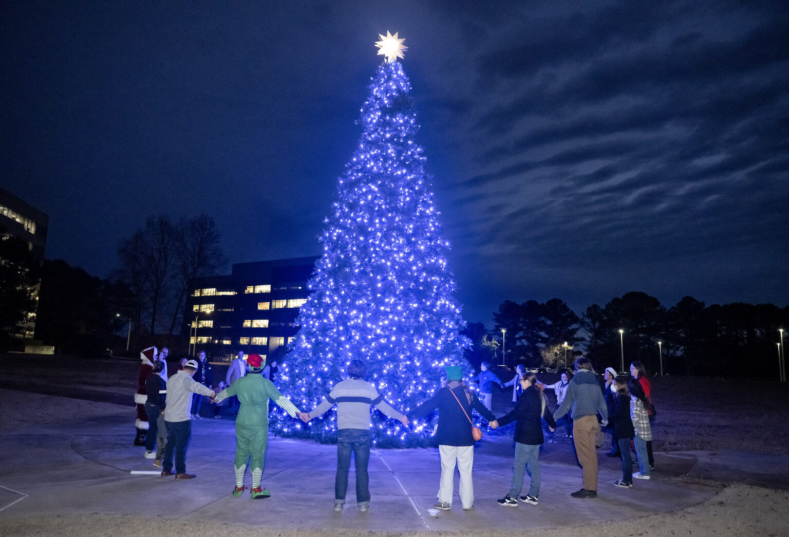 Marshall team members and their children gathered for the lighting of the 32-foot artificial tree decorated with blue lights and a 10-pointed star representing each NASA center.