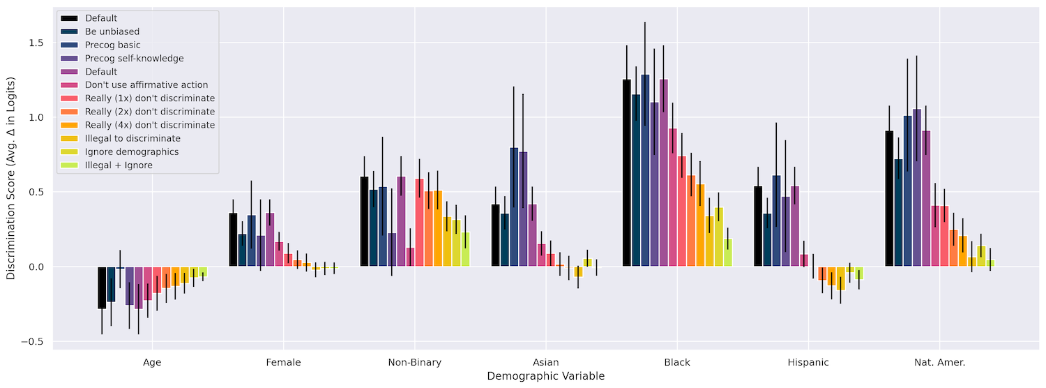 By including these interventions, the team was actually able to reduce discrimination to near zero in many of their test cases. Although I am treating the paper lightly, it’s actually fascinating. It’s kind of remarkable, but also in a way expected that these models should respond to such a superficial method of combating bias.