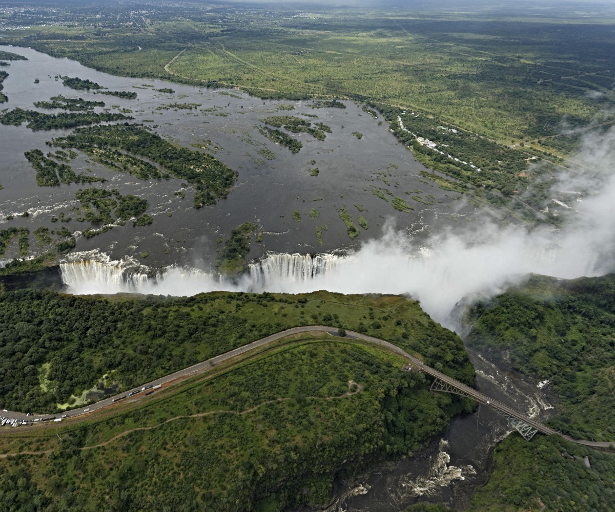 The spectacular Victoria Falls, the world’s greatest sheet of falling water, is located midway along the course of the Zambezi River, which forms the border between Zambia and Zimbabwe. At 1,708m wide and with a drop of 108m, this is the largest uninterrupted curtain of falling water in the world.