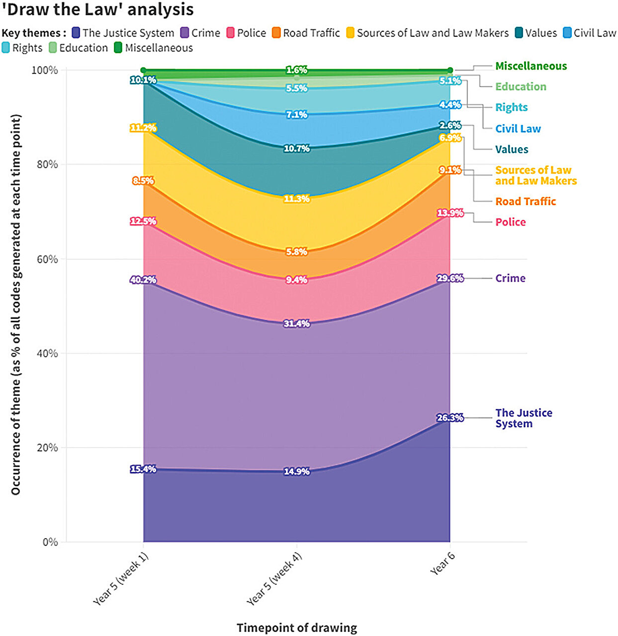 The emergence of these additional themes that directly reflect the subject matter covered in the sessions suggests that School Tasking is, at least by the final session, disrupting, to some extent, children’s conceptions of what law is, how it works, and who it is for.