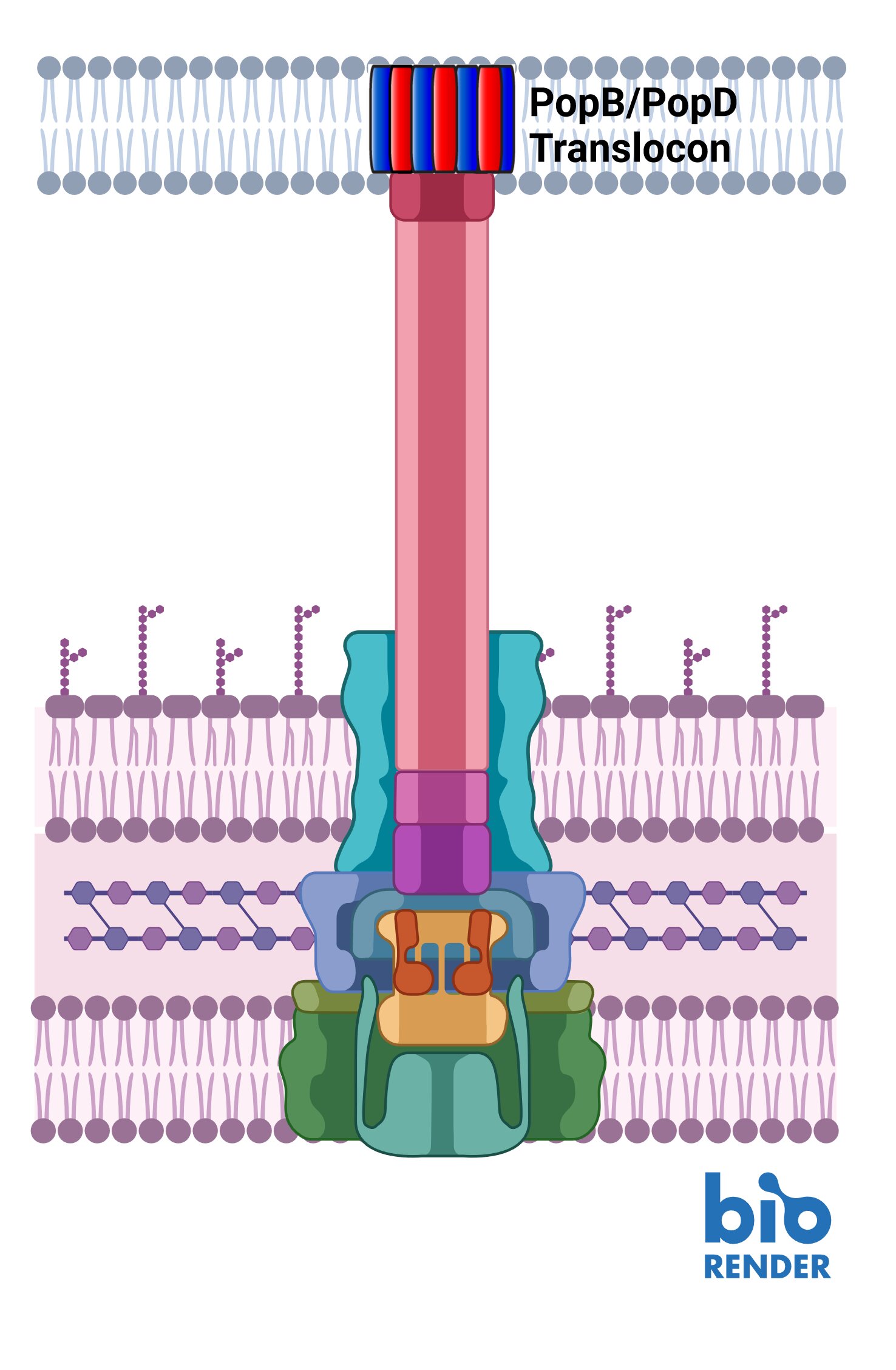 Like the pathogenic cell, host cells also have thick, difficult-to-penetrate cell walls. In order to breach them, pathogens have developed a syringe-like machine that first secretes two proteins, known as PopD and PopB. Neither PopD nor PopB individually can breach the cell wall, but the two proteins together can create a “translocon”—the cellular equivalent of a tunnel through the cell membrane. Once the tunnel is established, the pathogenic cell can inject other proteins that do the work of infecting the host.