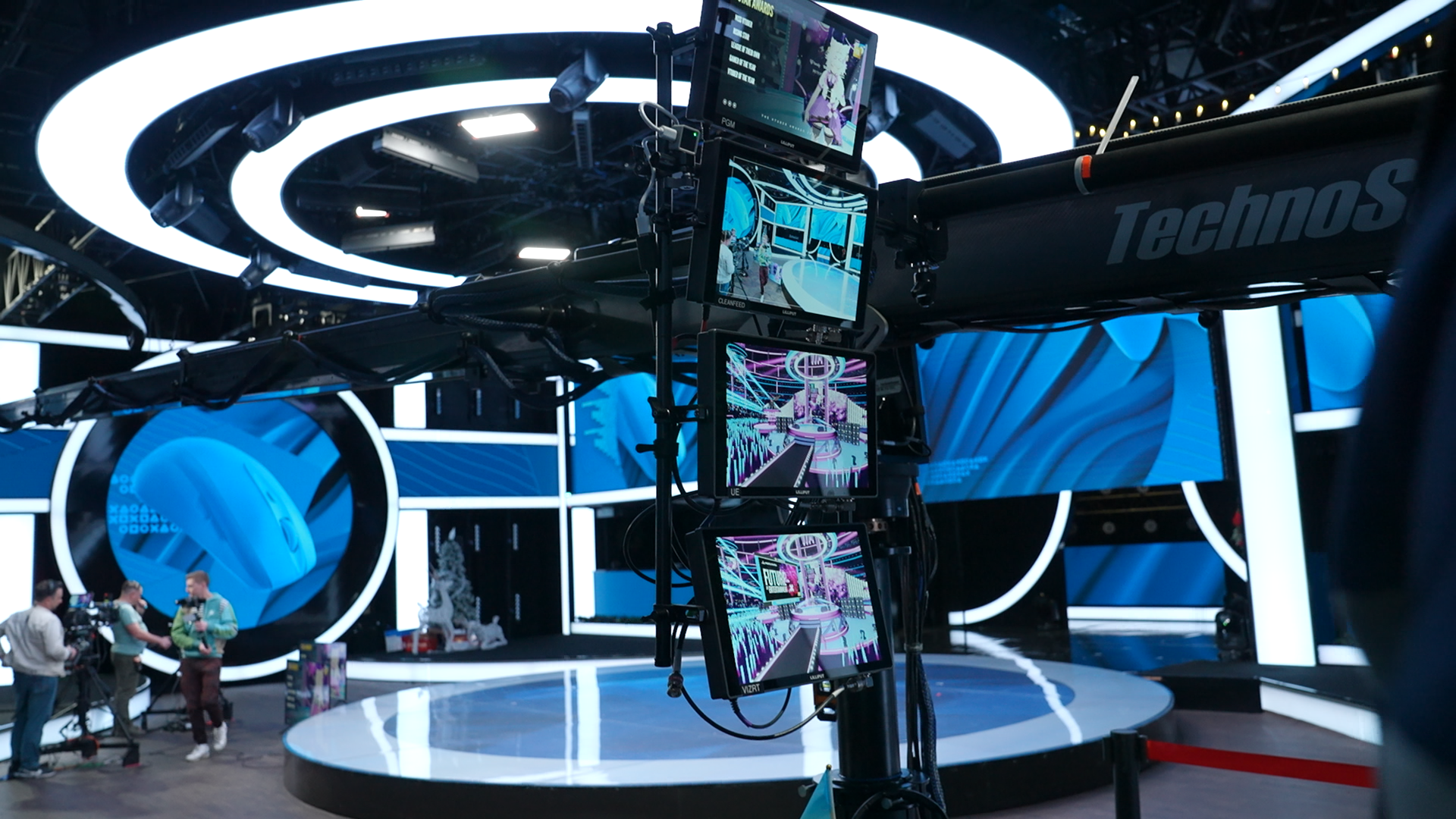 The stream depicted a vast arena, but Filian’s avatar was essentially confined to a smaller circular stage surrounded by screens, which was a virtually constructed version of WePlay’s physical production stage. In real life, camera operators controlled three cameras linked to virtual angles, so that each physical pan, tilt and focus pull was reflected in the virtual broadcast. The physical operators could switch between multiple different angles in the stadium using iPads connected to the cameras, so that the production appeared to use at least a dozen cameras instead of just three. The physical lights on the stage were connected to corresponding virtual lights, so that WePlay could control the stadium’s spotlights by activating the real ones. WePlay also connected Resolume, a software for live event visuals, to the virtual venue to control the graphics that played on the VR stage’s screens.