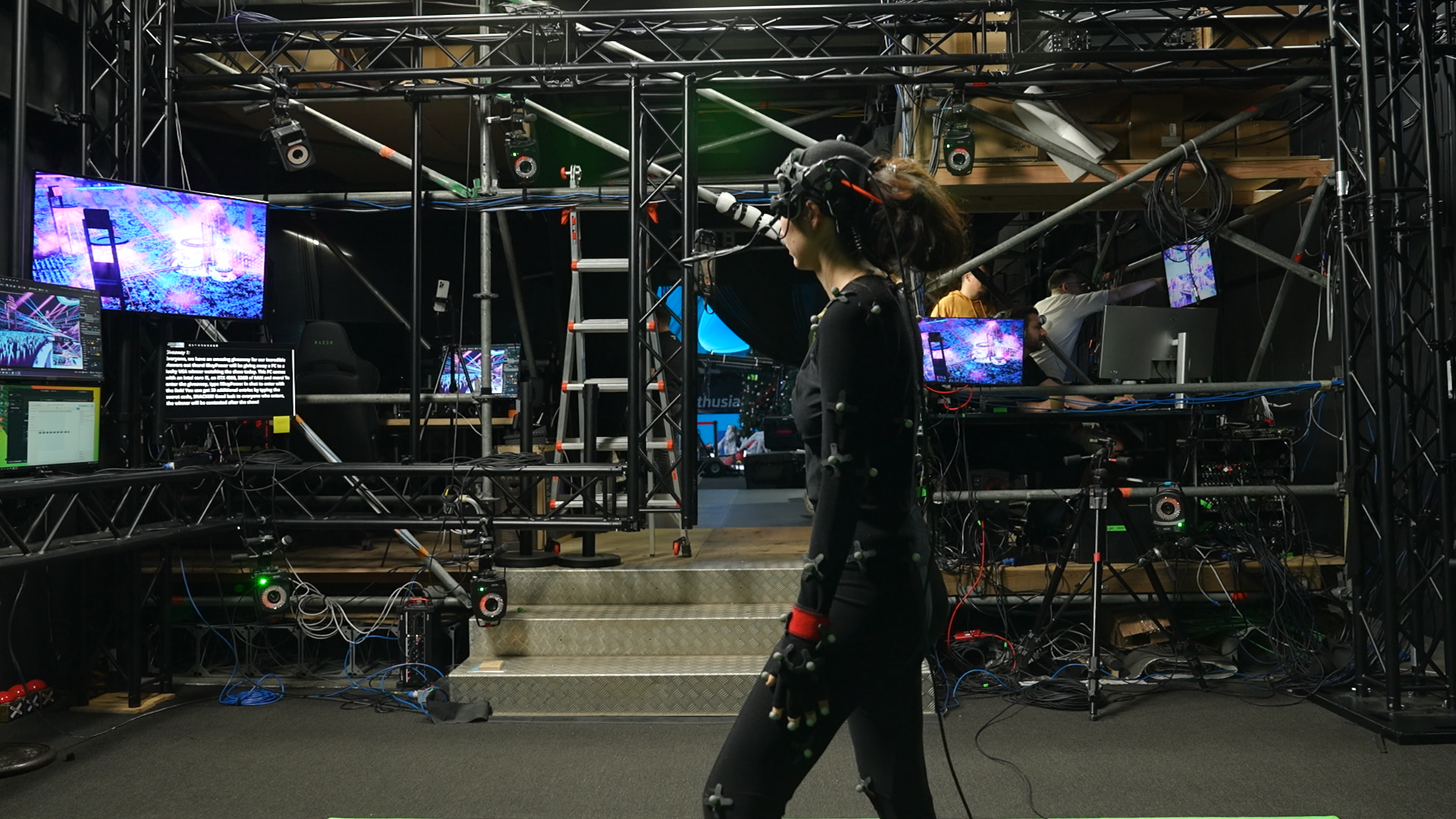 A crew member standing in for Filian tests the mocap suit and helmet. Image Credits: WePlay Studios