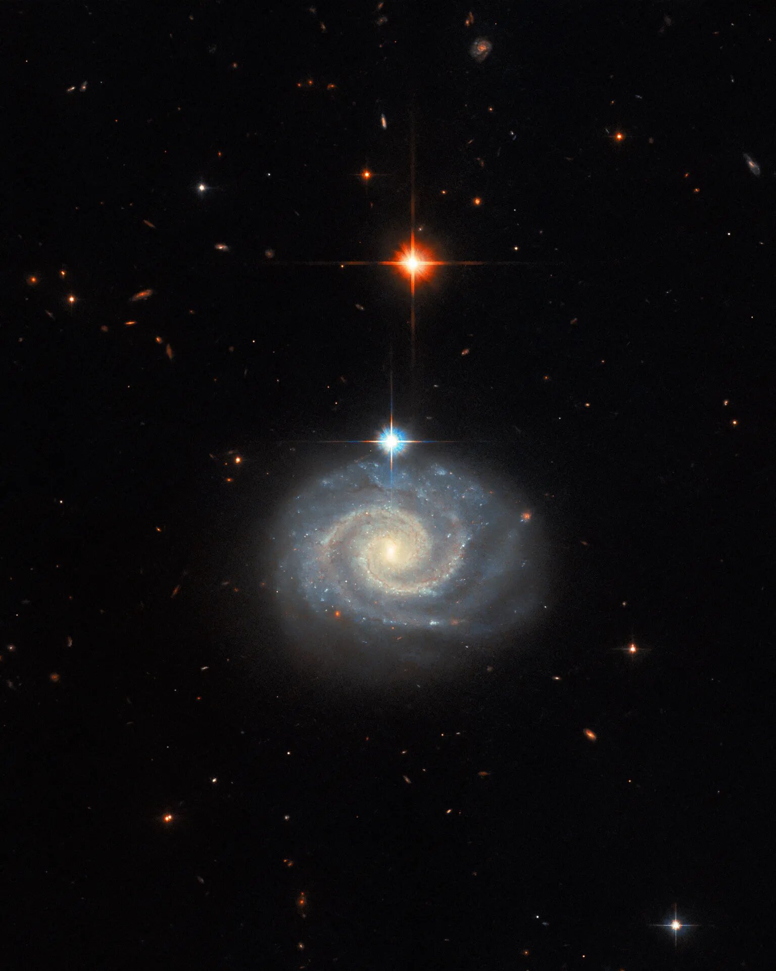 This whirling image features a bright spiral galaxy known as MCG-01-24-014, which is located about 275 million light-years from Earth. In addition to being a well-defined spiral galaxy, MCG-01-24-014 has an extremely energetic core known as an active galactic nucleus (AGN) and is categorized as a Type-2 Seyfert galaxy.