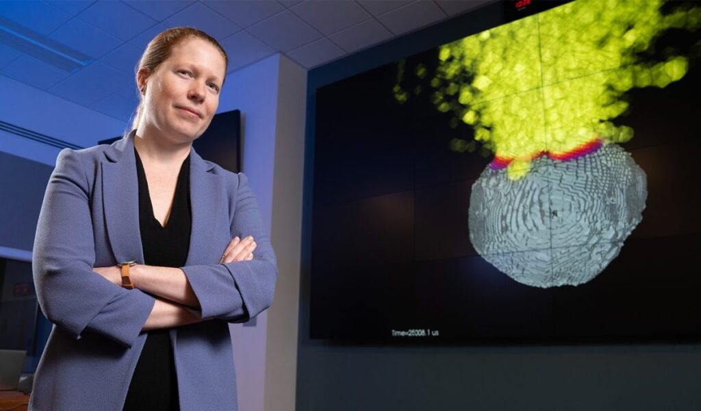 At Lawrence Livermore National Lab, a team led by Mary Burkey (above) presented a paper that moves the ball forward on what is in reality a fairly active area of research. As they point out, using a satellite as a missile isn’t always practical, and in fact detonating a nuclear explosive device as close as possible to the incoming object is potentially our best move.