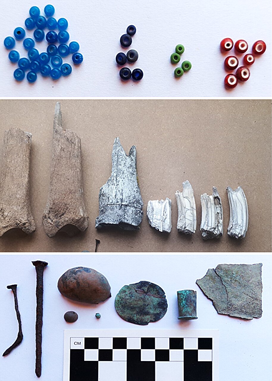 Artifacts found at the Chorrillo Grande 1 site include Venetian glass beads (top), horse bones and teeth (middle) and metal artifacts including nails and ornaments (bottom). Credit: Juan Bautista Belardi