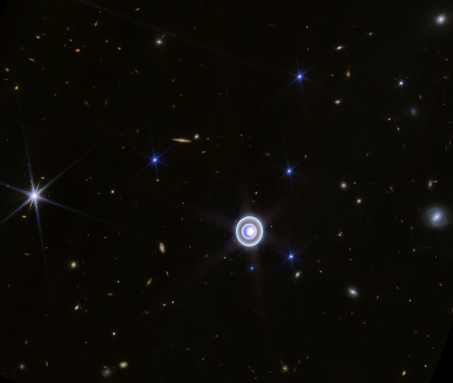 This Webb image also shows 14 of the planet’s 27 moons: Oberon, Titania, Umbriel, Juliet, Perdita, Rosalind, Puck, Belinda, Desdemona, Cressida, Ariel, Miranda, Bianca, and Portia. Webb’s extreme sensitivity also picks up a smattering of background galaxies—most appear as orange smudges, and there are two larger, fuzzy white galaxies to the right of the planet in this field of view.