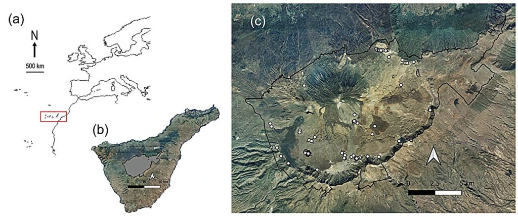 The Canary Islands, which lie within Macaronesia in the North Atlantic Ocean off the coast of Morocco and the Western Sahara, are a volcanic archipelago consisting of seven main islands and numerous smaller ones. Tenerife, the largest island, includes a number of varying environments, including sandy coastal areas, cloud forest, pine forest, and—at the highest altitudes—alpine scrub, where climate conditions are extreme and endemic species of considerable variation are found in small numbers.