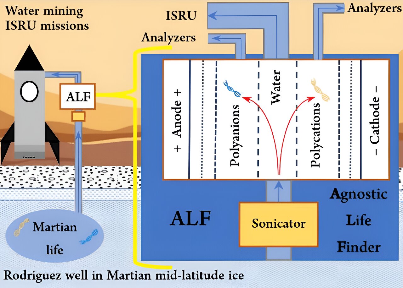 As the mined water-ice is delivered with dust that, through dust storms, survey the entire accessible surface, this humongous sample will effectively enable a highly sensitive survey of the entire accessible Mars surface for life. This NIAC project will provide an “agnostic life finding” (ALF) system capable of extracting genetic polymers (DNA or alien) from these large ISRU water samples. ALF is agnostic because it exploits what synthetic biology taught us about the limited kinds of Darwinian genetic molecules. ALF also offers tools to partly analyze the polyelectrolytes in situ.