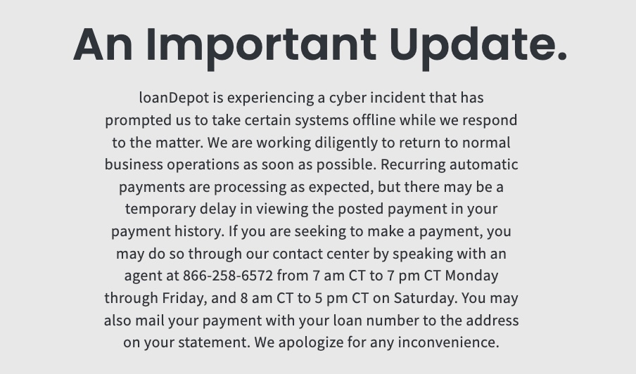 LoanDepot says it assists more than 27,000 customers monthly. Portions of LoanDepot’s website, including its customer portals, appear to be non-functional. One error message on a login page seen by TechCrunch tells users: “Recurring automatic payments are processing as expected, but there may be a temporary delay in viewing the posted payment in your payment history. If you are seeking to make a payment, you may do so through our contact center by speaking with an agent at 866-258-6572.”
