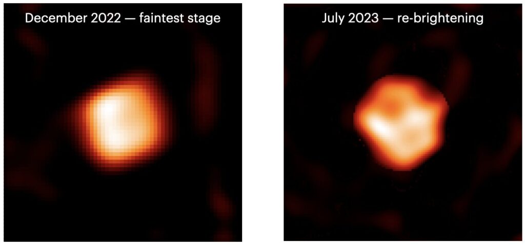 The final pictures show a star convulsed by motions in its outer layers that create fainter and brighter patches across its surface. Furthermore, the appearance changed significantly over the 10-month period of observations that coincided with the transition from its faintest state to a slow recovery toward its former brightness.