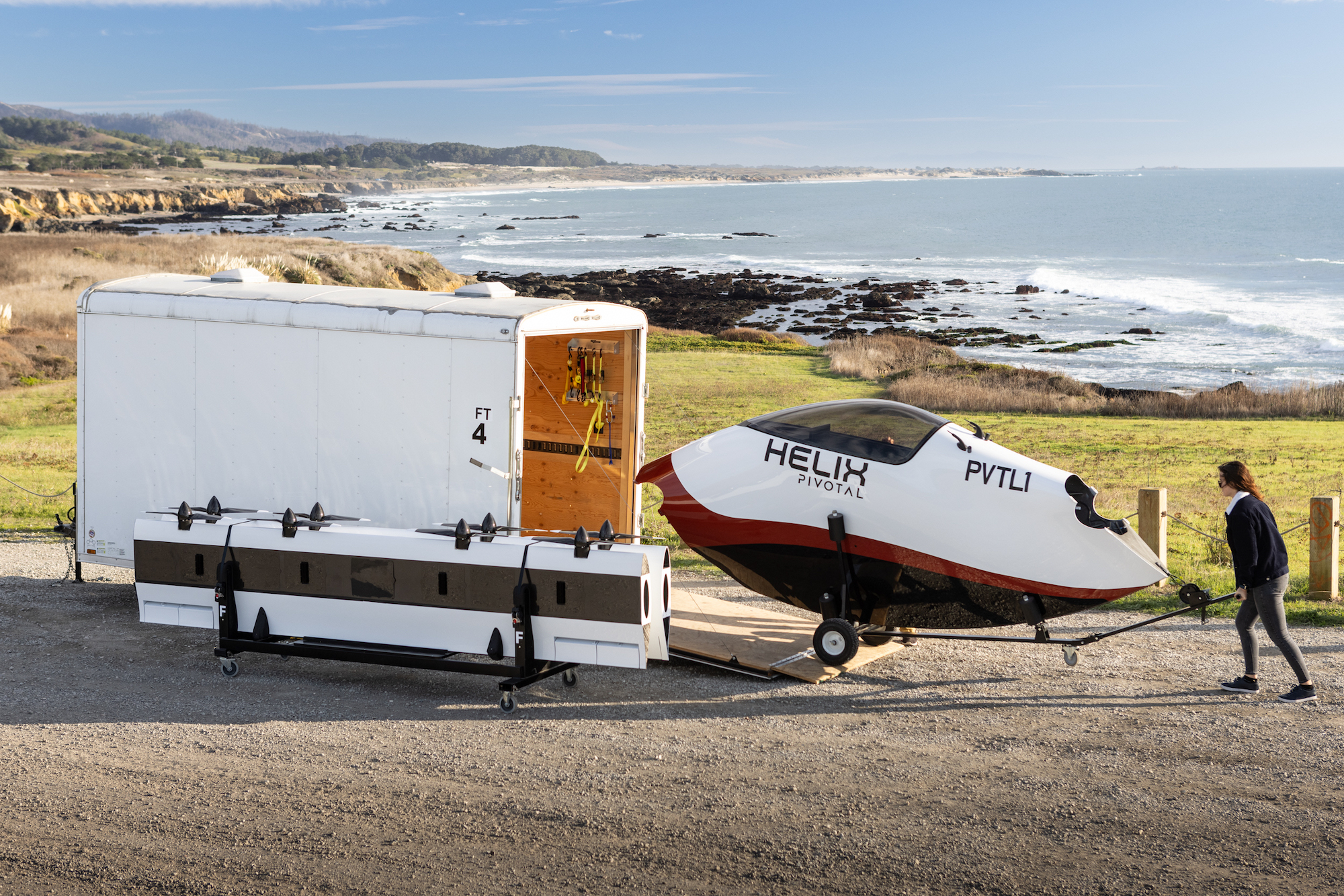 The second package starts at $240,000 and offers a gloss white-and-striped carbon fiber exterior finish and includes the features above, plus a trailer with dual-wing cart, 4k camera with landing assist, recording and sharing features, an ADS-B air traffic system, two chargers and an enhanced warranty. That trailer, by the way, is how owners might cart there Helix around. Pivotal says the Helix can be assembled in 30 minutes. When disassembled, it can fit into a 16-foot trailer.