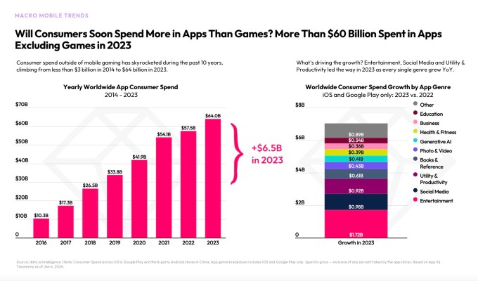 After the app economy slowed for the first time ever in 2022, things picked up pace again over the past year. According to app intelligence provider data.ai’s annual “State of Mobile” report, out today, consumer spending on apps saw a modest 3% increase year-over-year in 2023 to reach $171 billion across the App Store, Google Play, and third-party Android app stores in Chiana. A growing part of that total consumer spend came from apps, not mobile games, thanks in part to TikTok’s success. However, app downloads remained flat last year at 257 billion, up only around 1% year-over-year.