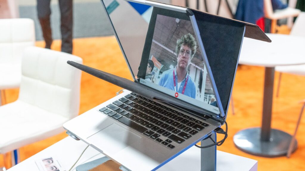 “When participating in a video call, you typically face the dilemma of choosing between looking at the camera or at your screen. To address this, we’ve developed a device that combines both elements, similar to a teleprompter. In its compact form, it resembles an iPad Pro, but it can be unfolded and mounted onto your laptop,” Gert Maass, founder and CEO at EyeQ explains in an interview with TechCrunch. “This device features a transparent mirror, allowing you to see through it while a camera located beneath the half-mirror records your image. It’s designed for easy installation, taking only a few seconds, and connects via a USB cable. This device is adaptable for both laptops and desktop monitors,”