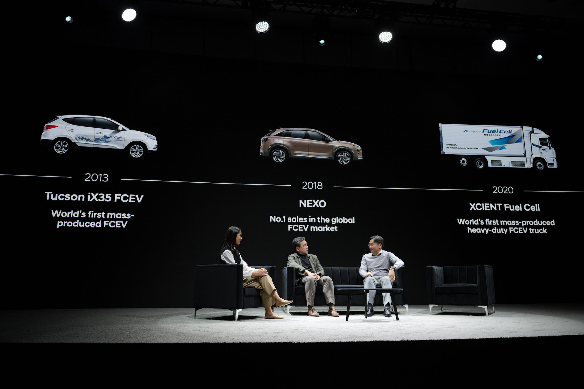 Jaehoon Chang, president and CEO of Hyundai Motor Co., center, and Chang Hwan Kim, senior vice president and head of battery development and hydrogen and fuel cell development for Hyundai Motor Co at CES 2024. Image credits: Getty images via Bloomberg