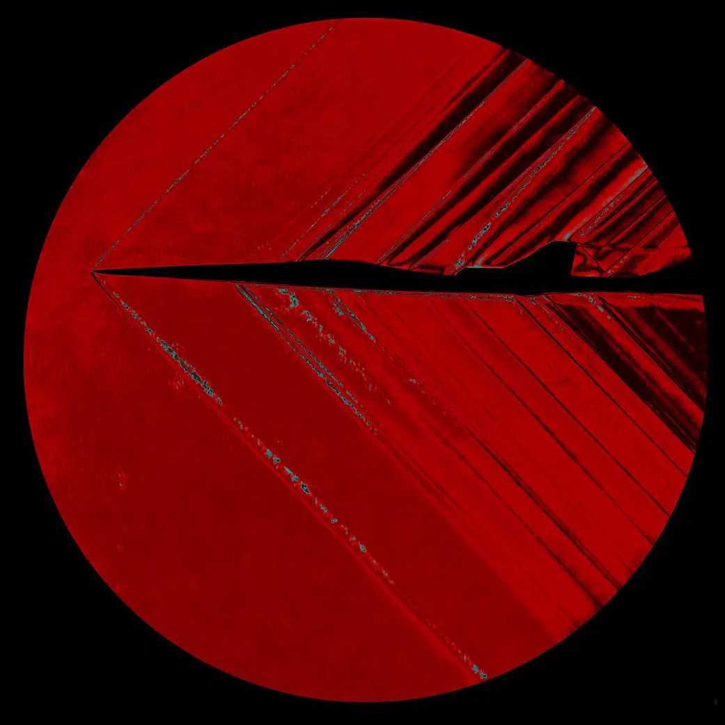 Schlieren image of a model X-59 producing a diffuse pressure wave at Mach speed. Image Credits: NASA