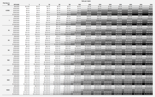 The important variables for this calculation is the file size in kilobytes, the fee rate in sats/vbyte, and the current BTCUSD price. With this little bit of information I was able to make a simple static table to see how different sized inscriptions will increase in USD cost as NGU for fees and BTCUSD.