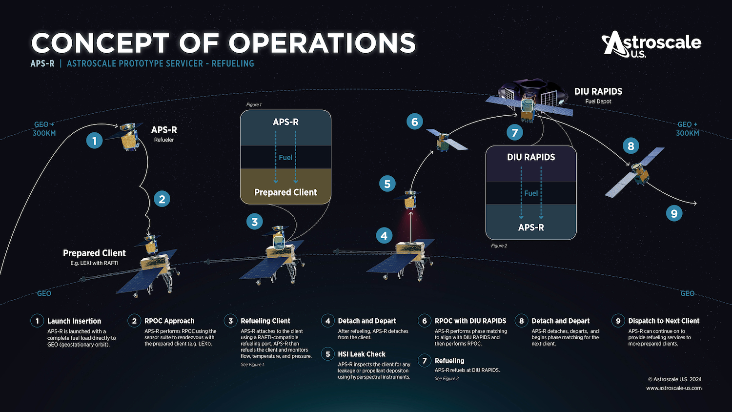 After refueling it, the APS-R will back off and perform an inspection of the client satellite, looking for any fuel leaks or other issues its operators might want to check. Then it ascends to GEO+ again and rendezvouses with a Defense Innovation Unit RAPIDS fuel depot, which is exactly what it sounds like: an orbital gas station.