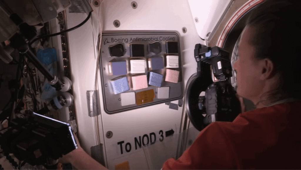 A current investigation, ISS Boeing Antimicrobial Coating, tests surface coatings designed to inhibit the growth of microbes to protect crew members and equipment on a spacecraft. On Earth, such coatings could help reduce diseases transmitted from touching surfaces in aircraft cabins, health care facilities, public transportation, and other settings.
