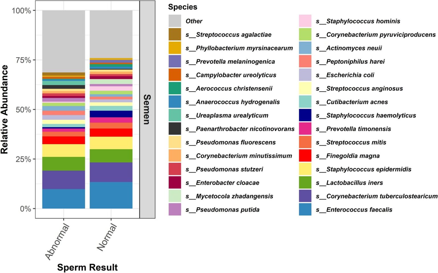 Researchers also discovered that three types of bacteria in the Pseudomonas group were present in patients with both normal and abnormal sperm concentrations. Microbes called Pseudomonas fluorescens and Pseudomonas stutzeri were more common in patients with abnormal sperm concentrations, while Pseudomonas putida was less common in samples with abnormal sperm concentrations.
