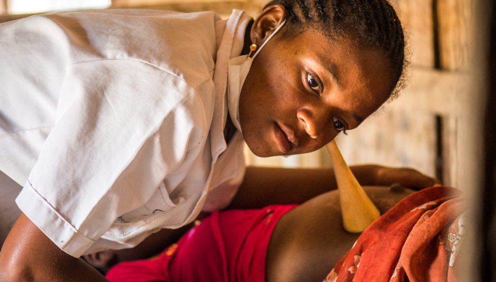 A young woman being attended to by a nurse at a health clinic in Sierra Leone. Researchers have found that a monthly course of the antimalarial combination drug dihydroartemisinin–piperaquine added to a daily regimen of the antibiotic co-trimoxazole reduces the risk of malaria in pregnancy by 68 per cent. Copyright: Rawpixel, (CC0 1.0 DEED).