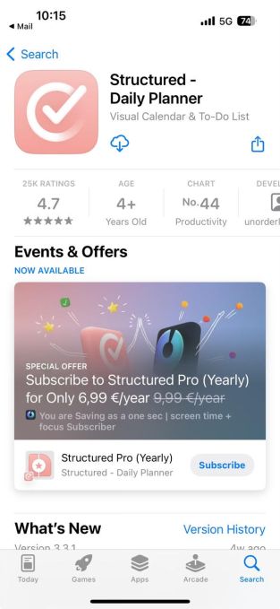 With contingent pricing, customers who subscribe to one of the apps can receive a discount if subscribing to the other. This deal is marketed in the App Store’s “Events & Offers” section, where it will feature the new, lower price ahead of the current subscription price, which is crossed out. This is followed by a note about the savings (e.g. “You are saving as Structured – Daily Planner Subscriber.”)