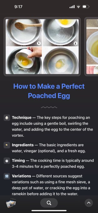 For instance, when I searched “How to make a perfectly poached egg,” Arc Search made a page for me with sections like “Ingredients and Tools,” “Poaching technique,” “Cooking process,” and additional tips. The page also had a bunch of useful photos and videos.