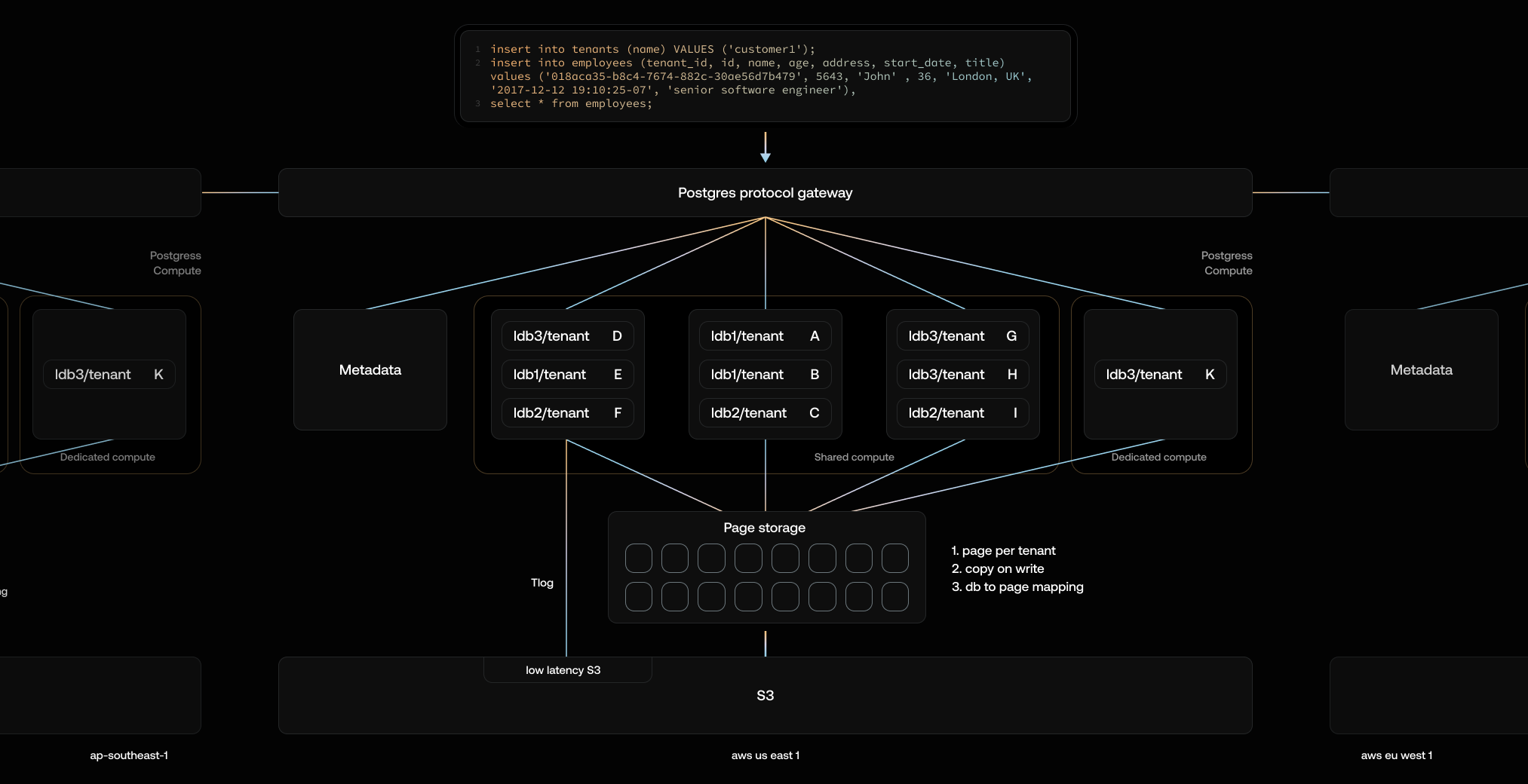 Traditionally, the team argued, solving problems around data and database management was always an application problem rather than a database problem. Nile is turning this on its head by making multi-tenancy a core feature of its Postgres solution and by separating the data layer from the compute layer. That means users can connect a virtual tenant database either to a shared compute service or attach a dedicated compute node to it, for example. Developers just need to define wich database the application needs to speak to and Nile then provides the isolation at the session and — coming soon — the connection level.