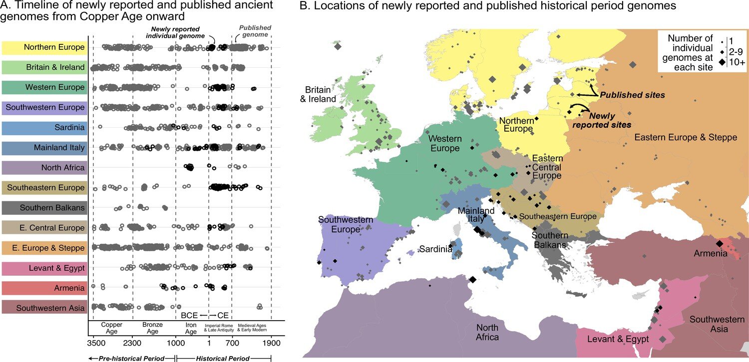 They used existing DNA data from thousands of skeletons that had been collected from the empire as well as central Europe, Eastern Europe and Central Asia, Britain and Northern Europe, and North Africa. They additionally sequenced 204 new genomes from 53 archaeological sites in 18 countries. Most were from individuals who died during the time periods known as imperial Rome and late antiquity, from the first to seventh centuries BCE.