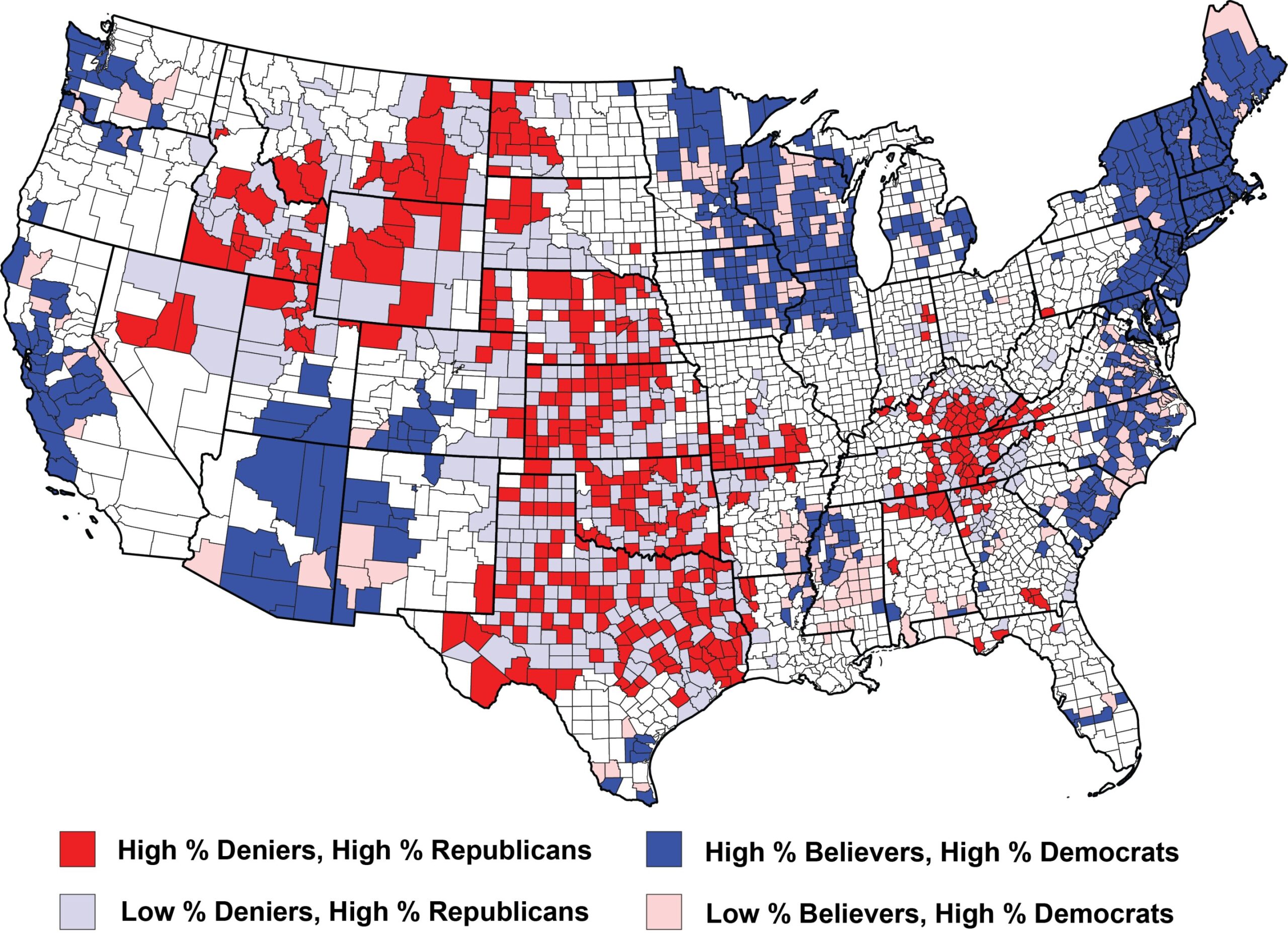Similarly, the average percentage of deniers in Texas is 21%, but at the county level, this ranges from 13% in Travis County (where the state capital, Austin, is located) to 67% in Hockley County (near Lubbock in northwest Texas).