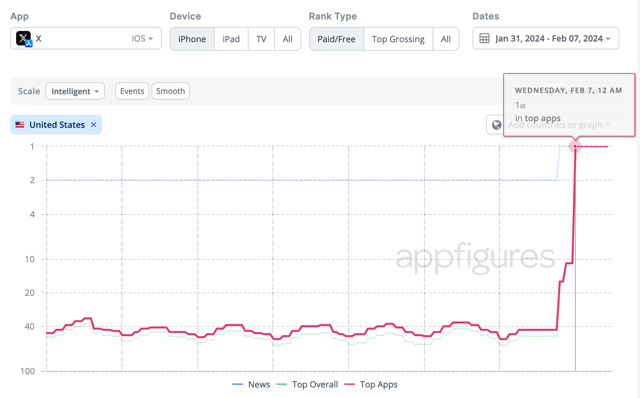 The timing of X’s spike to the top of the App Store is also notable for another reason, besides the Tucker Carlson news.