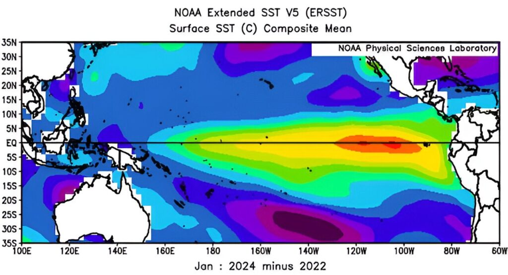 That strong El Niño is now starting to weaken and will likely be gone by late spring 2024.