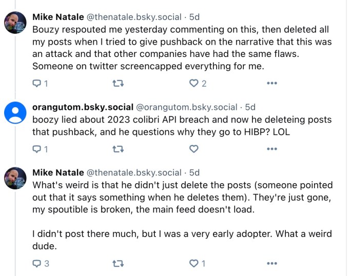 In another reply, Natale explained that Bouzy had initially reposted his posts on Spoutible to comment on the matter, but then deleted all of Natale’s posts when he pushed back against “the narrative that this was an attack” and “that other companies have had the same flaws.”