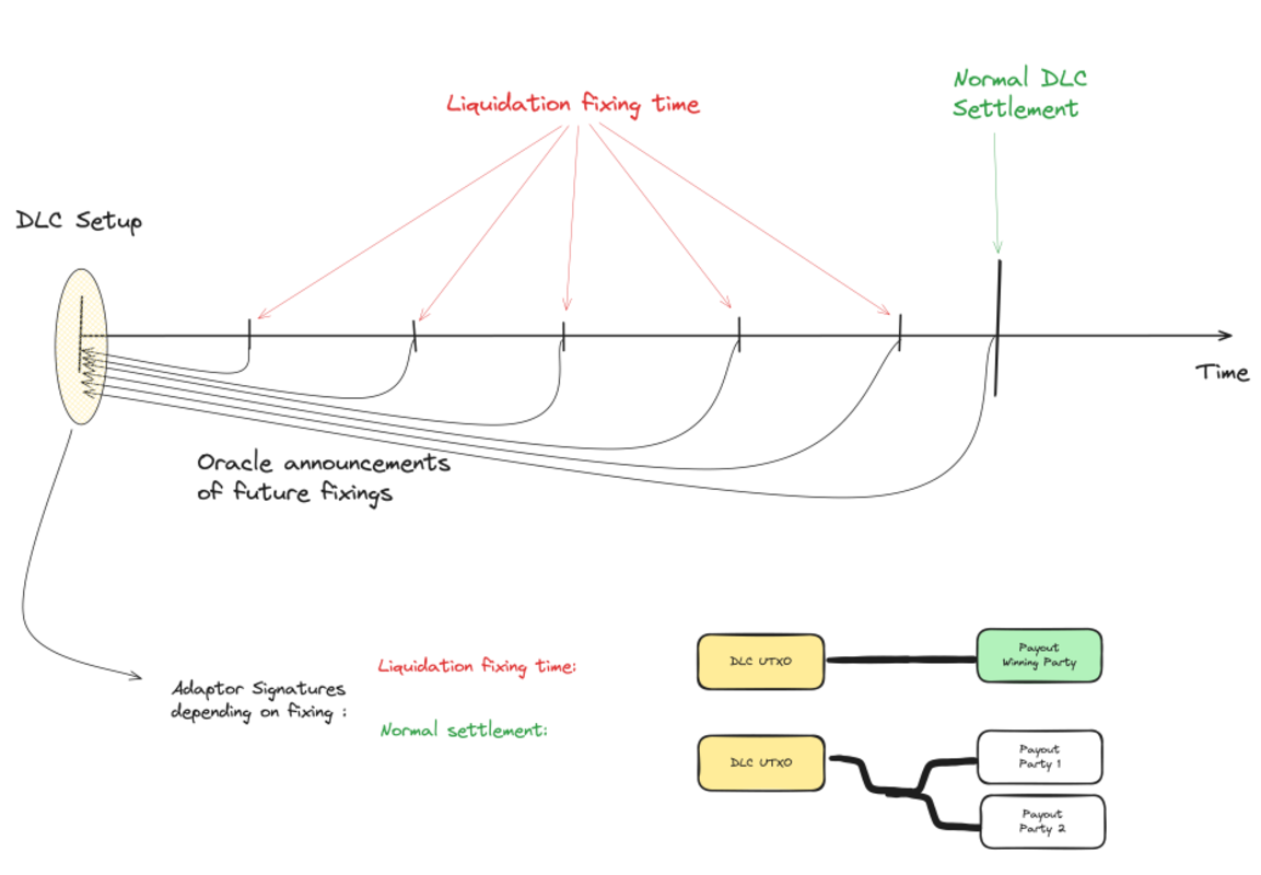 There was a nice infographic from the whitepaper included in the article LN Markets wrote announcing the proposal, but I feel like this one is a lot more intuitive to understand. In addition to all the CETs attached to oracle messages for price announcements that could occur at the contract expiry, there are also special settlement transactions for periods before the actual contract expiry – the interval of which can be decided by the participants in line with the frequency the oracle publishes price messages at. Each party has one special CET for each of these “liquidation times”, where if the price is outside of the contract range (i.e. all of the funds are owed to a single side) at any of those liquidation points they can simply submit this transaction and settle the contract earlier.