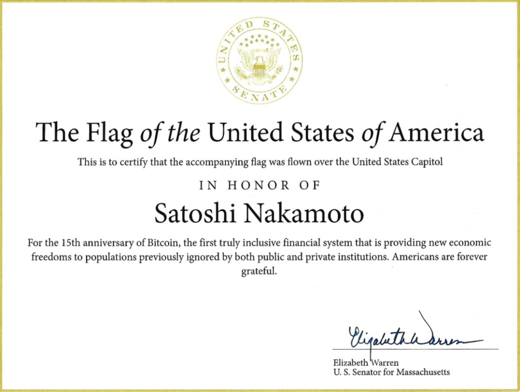 While the sudden embrace of Bitcoin by the Massachusetts Senator may seem a surprise, her career-long rhetoric about fighting for the financially under-served has finally taken shape within this tangible statement. As if speaking to her campaign promises to champion the working class negatively affected by corruption within both the government and the banking sector, the certificate produced by the Architect of the Capitol in recognition of the flag notes the “new economic freedoms to populations previously ignored by both private and public institutions” brought forward by Nakamoto’s Bitcoin.