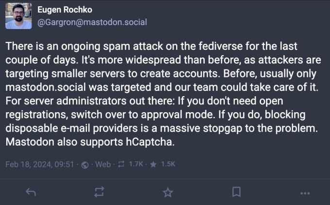 A spam attack that impacted the open source X rival Mastodon, Misskey and other apps highlights how the decentralized social web, also known as the fediverse, is open to abuse. Over the past several days, attackers have targeted smaller Mastodon servers, taking advantage of open registrations to automate the creation of spam accounts. Mastodon founder and CEO Eugen Rochko confirmed the attack in a post over the weekend, adding that Mastodon server administrators should switch over registration to approval mode and block disposal email providers to help combat the problem.