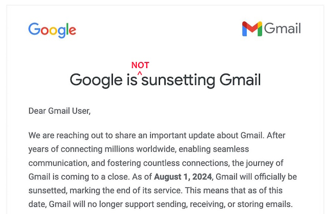 Update: You may be here because you heard Google is “sunsetting Gmail” this year, as a fast-spreading hoax online has it. The hoax purports to show an email from Google saying that “the journey of Gmail is coming to a close.” Here’s one version we spotted on Twitter/X: