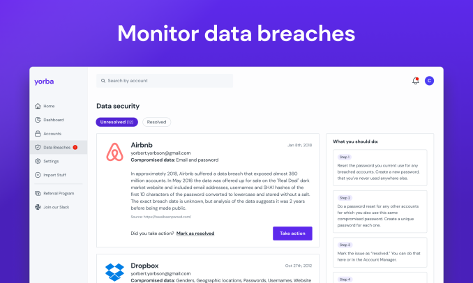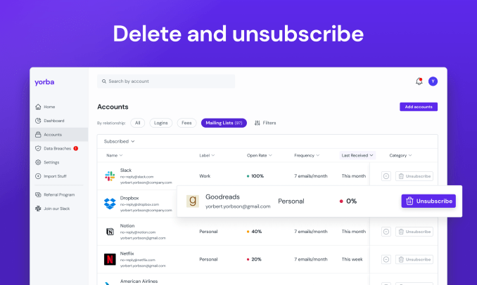 In addition to its mailing list and subscription management, Yorba can also warn you about accounts associated with data breaches, a feature password managers also offer, and can help you discover old accounts you no longer use, view stats on things like how often an account emails you and how often you actually open those emails.