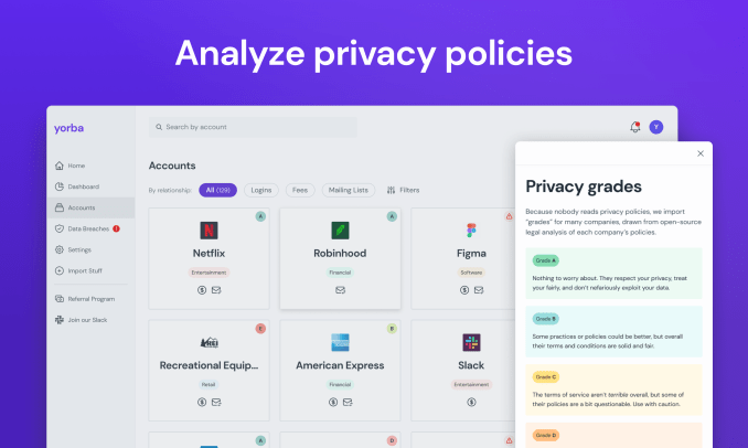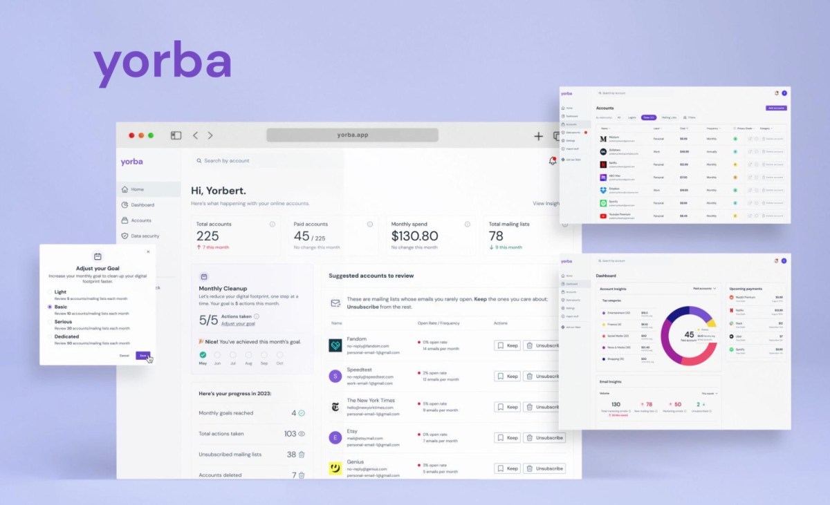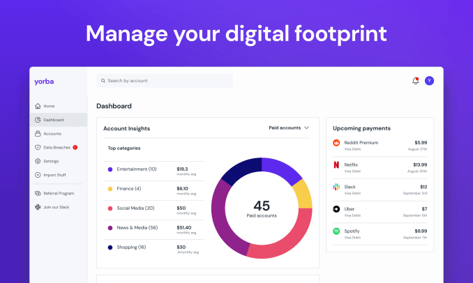 Spend enough time online, and you’ll collect a digital paper trail of accounts, logins, subscriptions, mailing lists and passwords wrapped up in data breaches. A new startup called Yorba can help you get a better handle on your ever-expanding digital footprint with the launch of its multi-purpose tool for decluttering your online life. From its web-based dashboard, you can organize, monitor and manage your online accounts, unsubscribe from mailing lists, cancel subscriptions, review privacy policies and more.