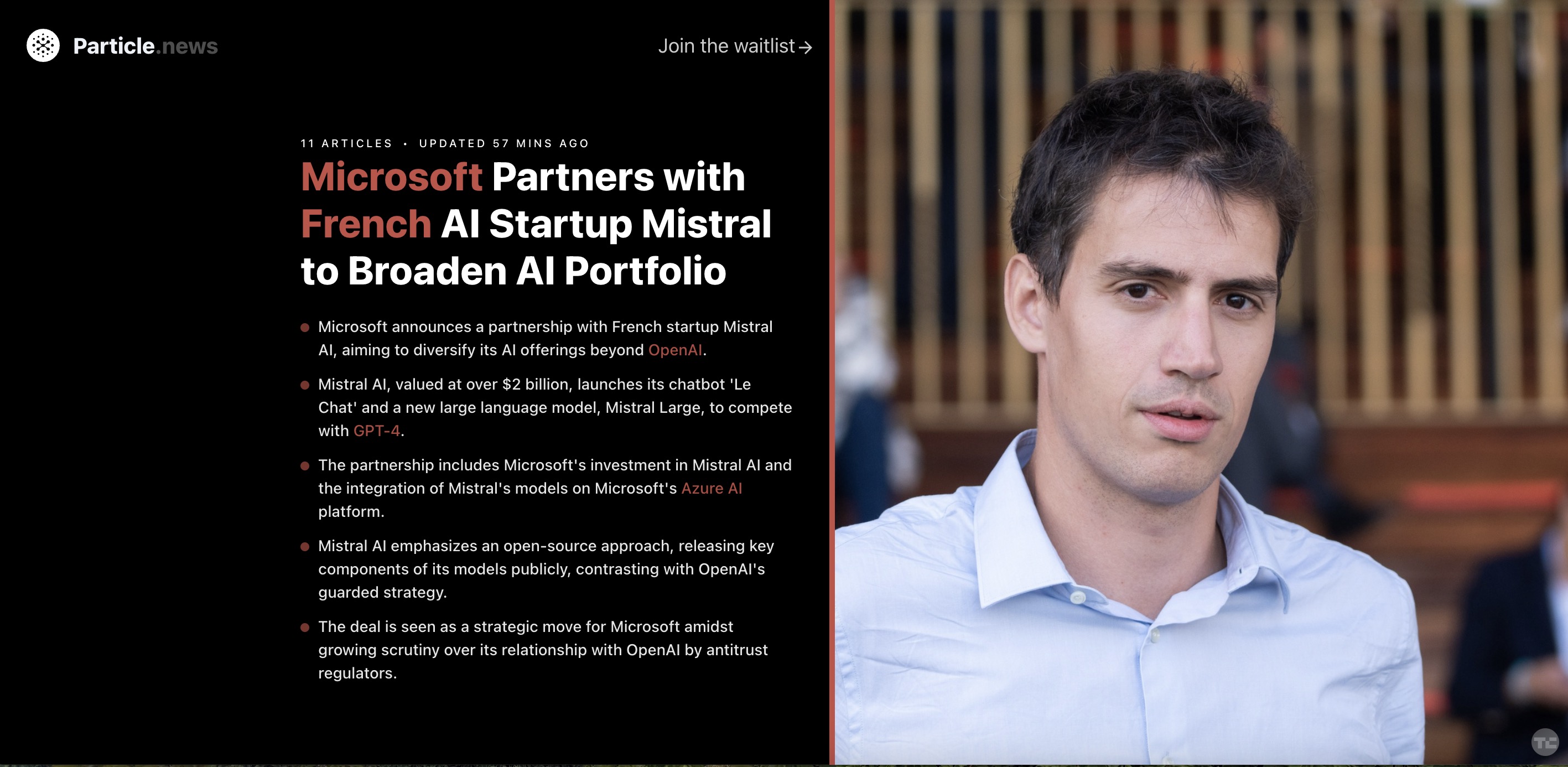 Particle offers a demo of its technology for logged-out users via its website, where articles are featured along with their summary, timestamp as to when they were last updated, and, in a small section at the bottom, the sources they draw from.