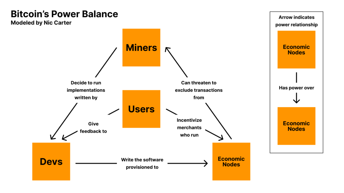 As we consider the infighting happening within Bitcoin, it is important to understand the different parties within bitcoin and how each of the powers balance each other out. In 2019, Nic Carter illustrated Bitcoin’s Power Balance Model. This model shows the key roles in Bitcoin and the relationship between each one. You can see the circular feedback loop between Miners -> Devs -> Economic Nodes. In a vacuum these three roles would perpetually pump each other with nothing to keep them in check. At the heart of the model are the Users who keep Devs and Economic nodes in check.