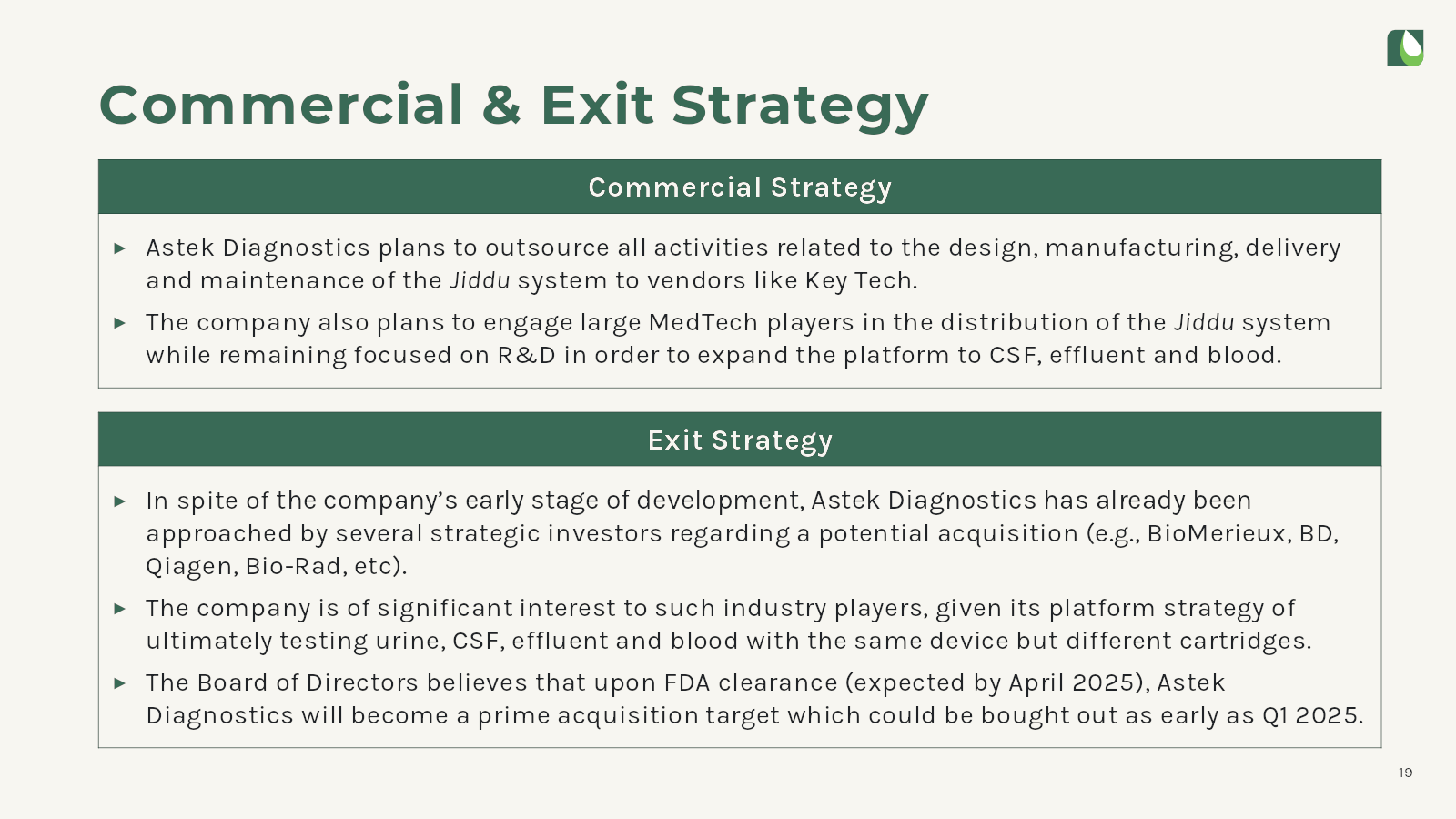 [Slide 19] Exit strategy, part 1. Image Credits: Astek Diagnostics