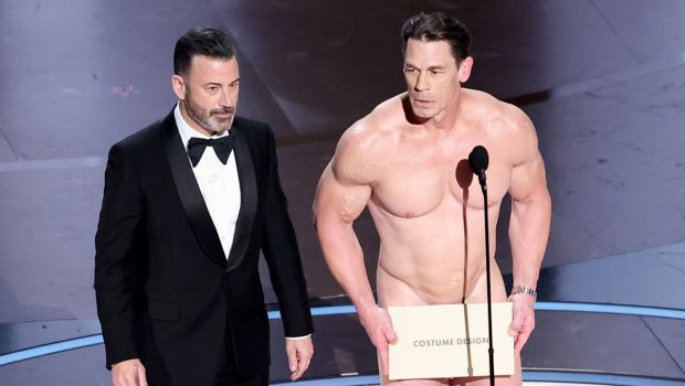 While holding the envelope for Costume Designer to cover his midsection, John Cena appeared on stage completely stripped. Jimmy, of course, was in on the fun, as he and John performed a convincing banter about his obvious discomfort walking on stage nude.