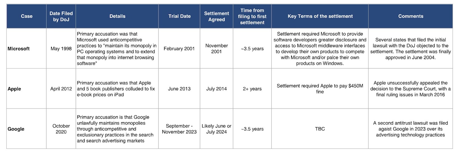 Said differently, yes, this lawsuit creates a stock overhang, but the market has a short term memory and in our view, fundamentals are more likely to drive Apple’s stock price over the next 12 months (and several years), rather than this lawsuit. We can cite a number of historical instances where companies in the thick of litigation threatening their core product/differentiating value proposition have outperformed despite the legal overhang: 1) Apple/Epic, where the stock outperformed by 15 points in the 18 months following Epic’s first legal filing threatening App Store take rates in August 2020, and 2) USA vs. Google, where the stock has nearly doubled since the DOJ first announced its investigation into Alphabet’s search practices. Our point being, regulation/litigation is a greater longterm tail risk for Apple than it has been historically, but the underlying drivers of the stock for the foreseeable future will almost certainly be fundamentals-based, especially given this lawsuit might not be resolved until at least 2028 (or even 2030) based on past cases.