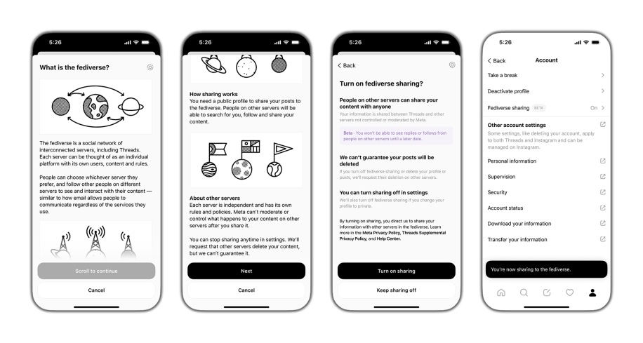 To opt into the integration, go to account settings and toggle on fediverse sharing. A pop-up will appear explaining what the fediverse is, which the company describes as a “social network of interconnected servers” where people can “follow other people on different servers to see and interact with their content — similar to how email allows people to communicate regardless of the services they choose.”